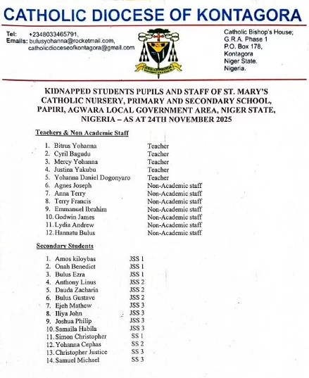 The Catholic Diocese of Kontagora in Niger State has published the names of 265 students, pupils and staff and teachers of St. Mary’s Catholic School, Papiri, Agwara LGA, who are still in captivity.