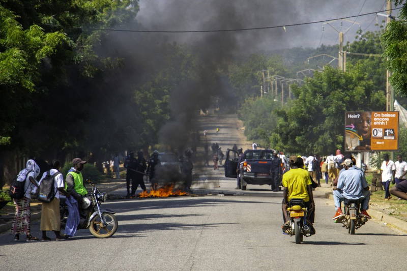 Burning barricades are seen in Garoua during a demonstration by supporters of the political opposition on October 21, 2025 ahead of the release of the results of the presidential vote. (Photo by AFP)